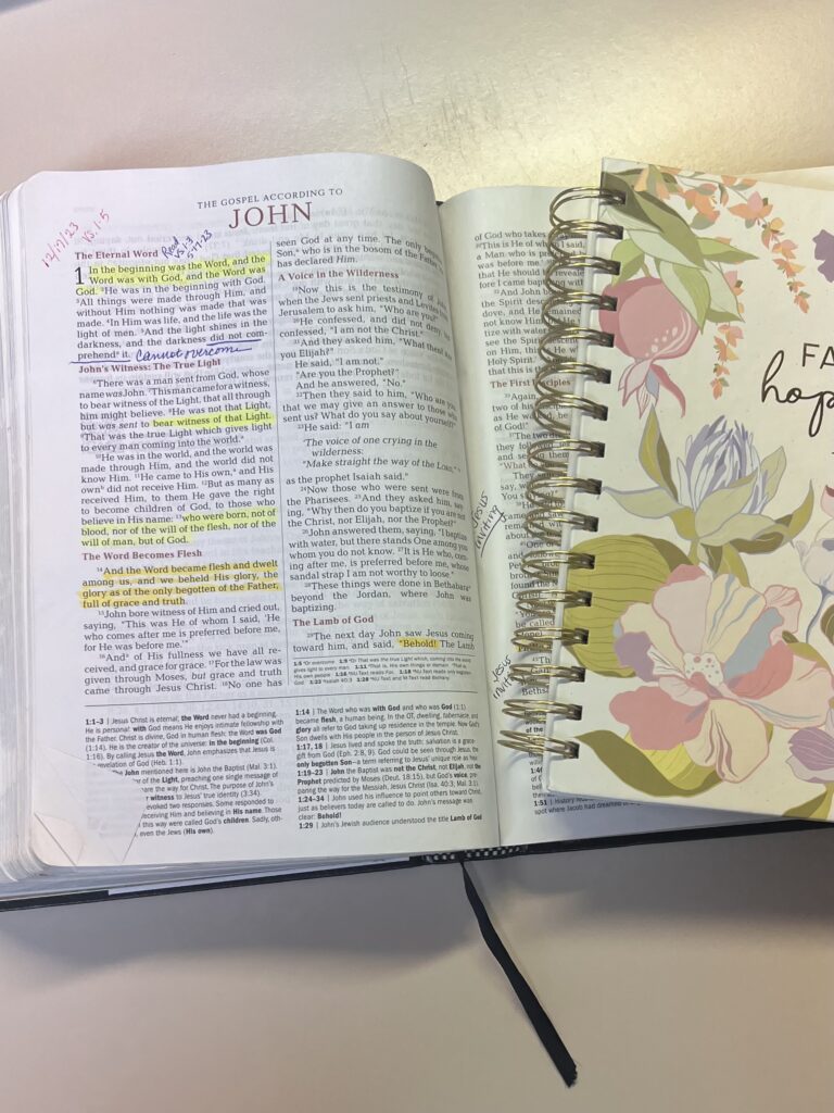 Fun Fact: My Bible is marked up with notes from study, sermons, and things God has used to get my attention. Don’t be afraid to mark your Bible up. It’s always a great reminder of growth.